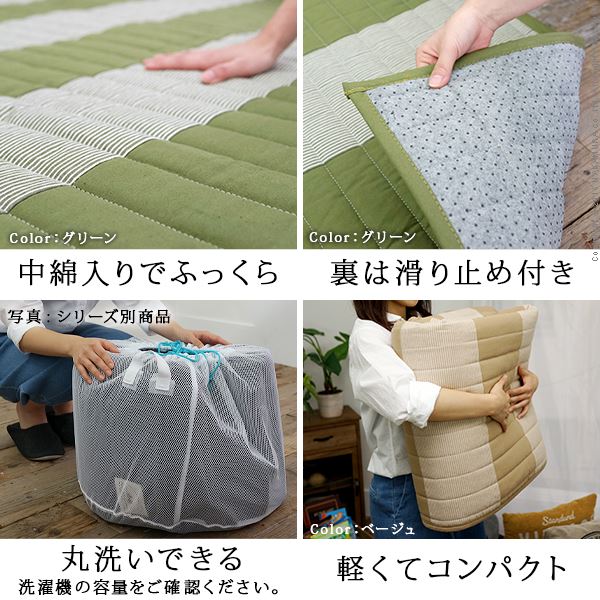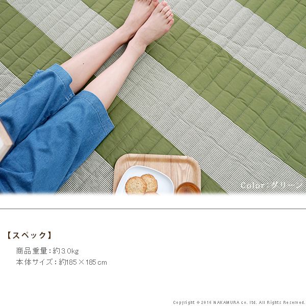 【カラーバリエーション】 ベージュ・グリーン・ブルー 【仕様】 本体:綿100% 裏面:不織布(滑り止め加工) 中綿:ポリエステル100% 【サイズ】 約185x185cm 重量:約3kg 株式会社ナカムラ(33100070)お届け営業日16時までにご注文・入金確認で3〜6営業日以内に出荷※土、日、祝日は出荷業務をお休みしております。