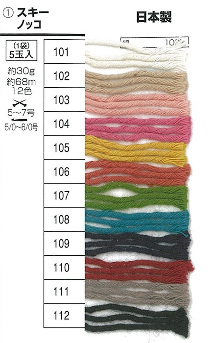※カラー選択有り 糸見本をご参考にご希望のカラーを選択してください 商品情報明細 メーカー スキー毛糸 商品名 ノッコ(5玉) 重さ 30g(グラム) 長さ(m) 68m(メートル) 使用針 棒針:5〜7号 かぎ針:5/0〜6/0号 適正ゲージ 19〜21目27〜29段 形状・品番・内容量 5玉入1袋 素材(特徴) 綿-100% 商品紹介 2019SSスキー毛糸新商品 サイトからのご注意 色番リストに載っていない色番はご注文できません。